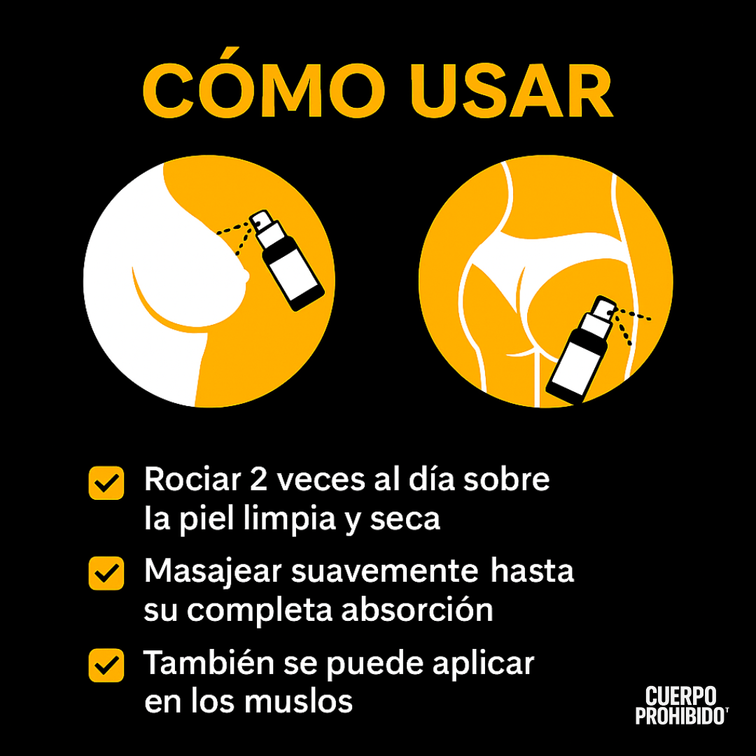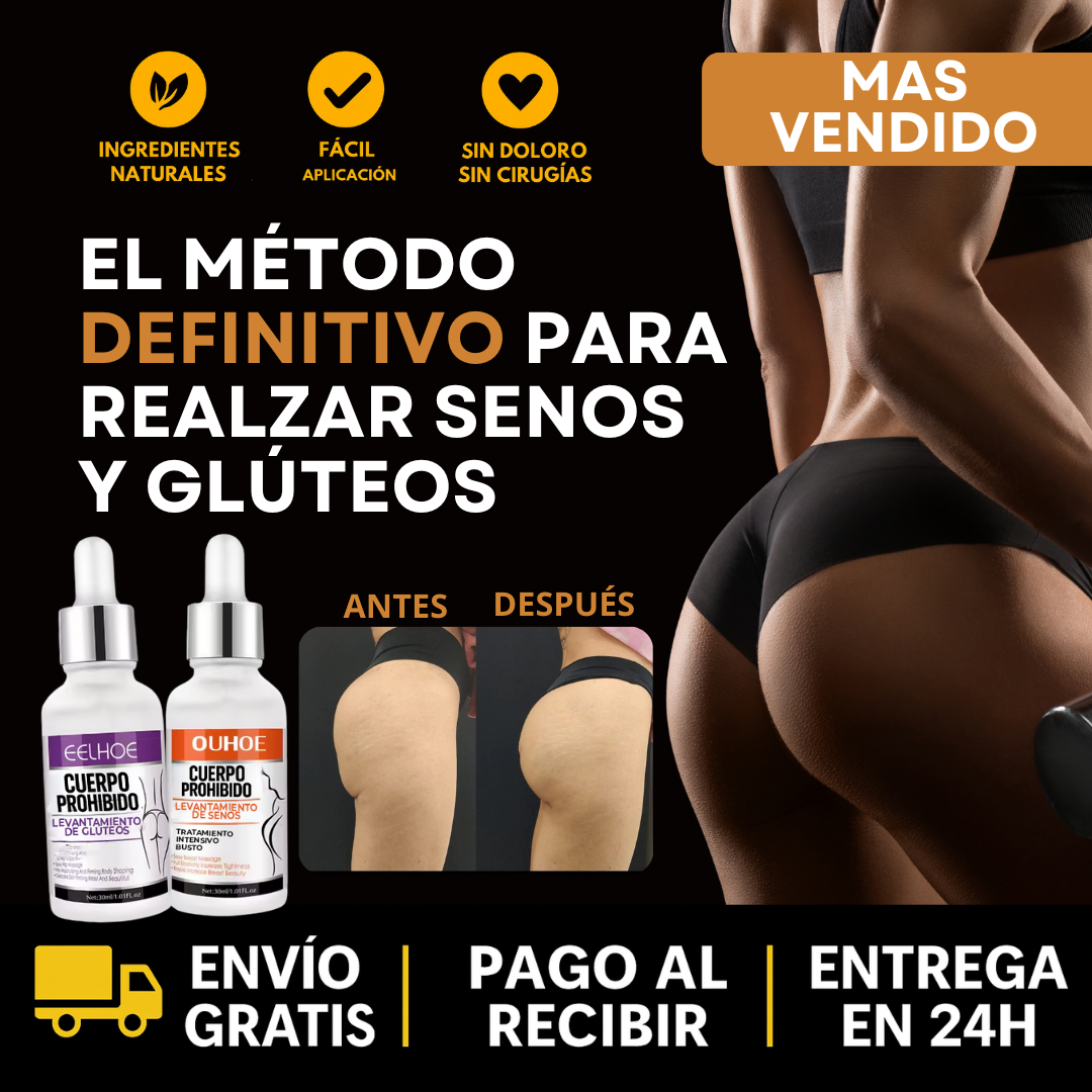 Detalles: Aceite reafirmante Cuerpo Prohibido™ para aumento y tonificación de glúteos y senos.