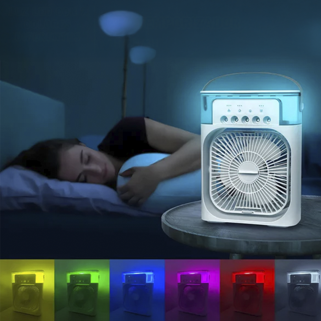 Airfresh® enfría, humidifica y aromatiza el ambiente en minutos. Ideal para quienes no soportan el calor intenso. Silencioso, compacto y perfecto para dormir, trabajar o relajarte donde quieras.